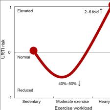 U kontekstu trenutne pandemije COVID-19, posebno je interesantan utjecaj tjelovježbe na infekcije respiratornog sustava vježbača. Bitno je istaknuti kako je nekoliko epidemioloških studija pokazalo kako redovito tjelesno vježbanje povezano sa smanjenom smrtnosti i pojavnosti gripe i pneumonije. Također je utvrđena inverzna povezanost između tjelovježbe umjerenim intenzitetom i pojavnosti infekcije gornjeg respiratornog traka, pri čemu je poznati svjetski stručnjak Dr. David Nieman pokazao da se ta povezanost može najbolje predstaviti tzv. „J“ krivuljom (slika 2; URTI – infekcija gornjeg respiratornog trakta).